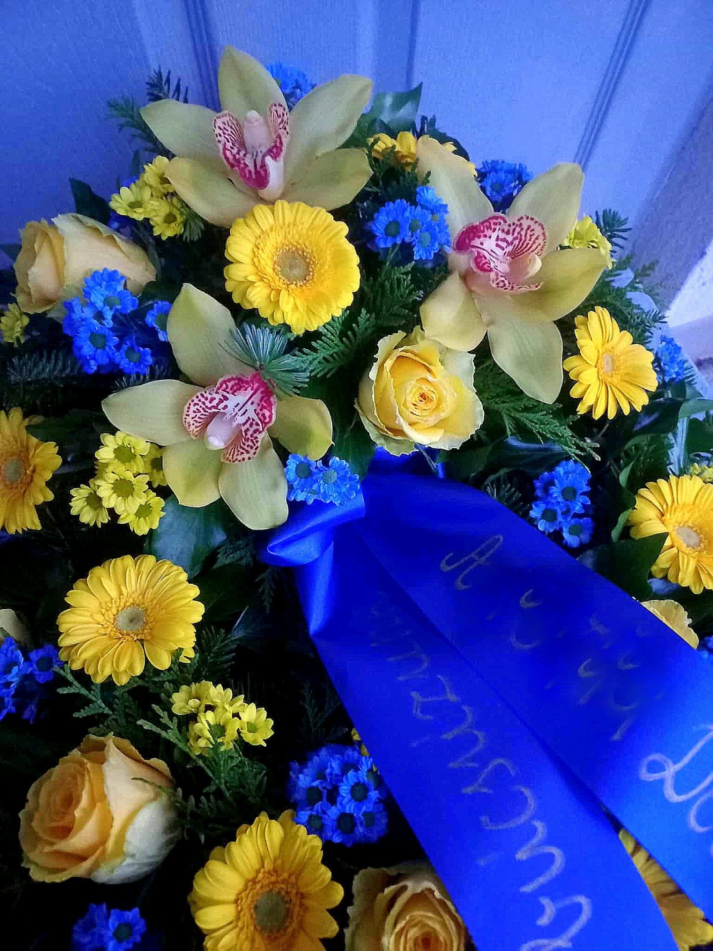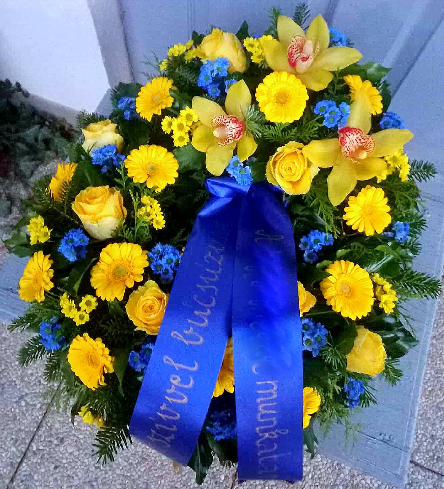Görögkoszorú- Kék-Sárga színvilággal. A megjelenített fotók többnyire illusztrációként szerepelnek. Tekintettel arra, hogy a virág egy friss termék így előfordulhat, hogy a kiválasztott koszorú valamelyik eleme nincs készleten. Ilyen esetben, a készleten lévő legszebb virágokból készítjük a csokrot. A koszorúink vizestűzőhabban készülnek, így biztosítva a virágok tartósságát. Az ár tartalmazza a szalag és felirat árát.