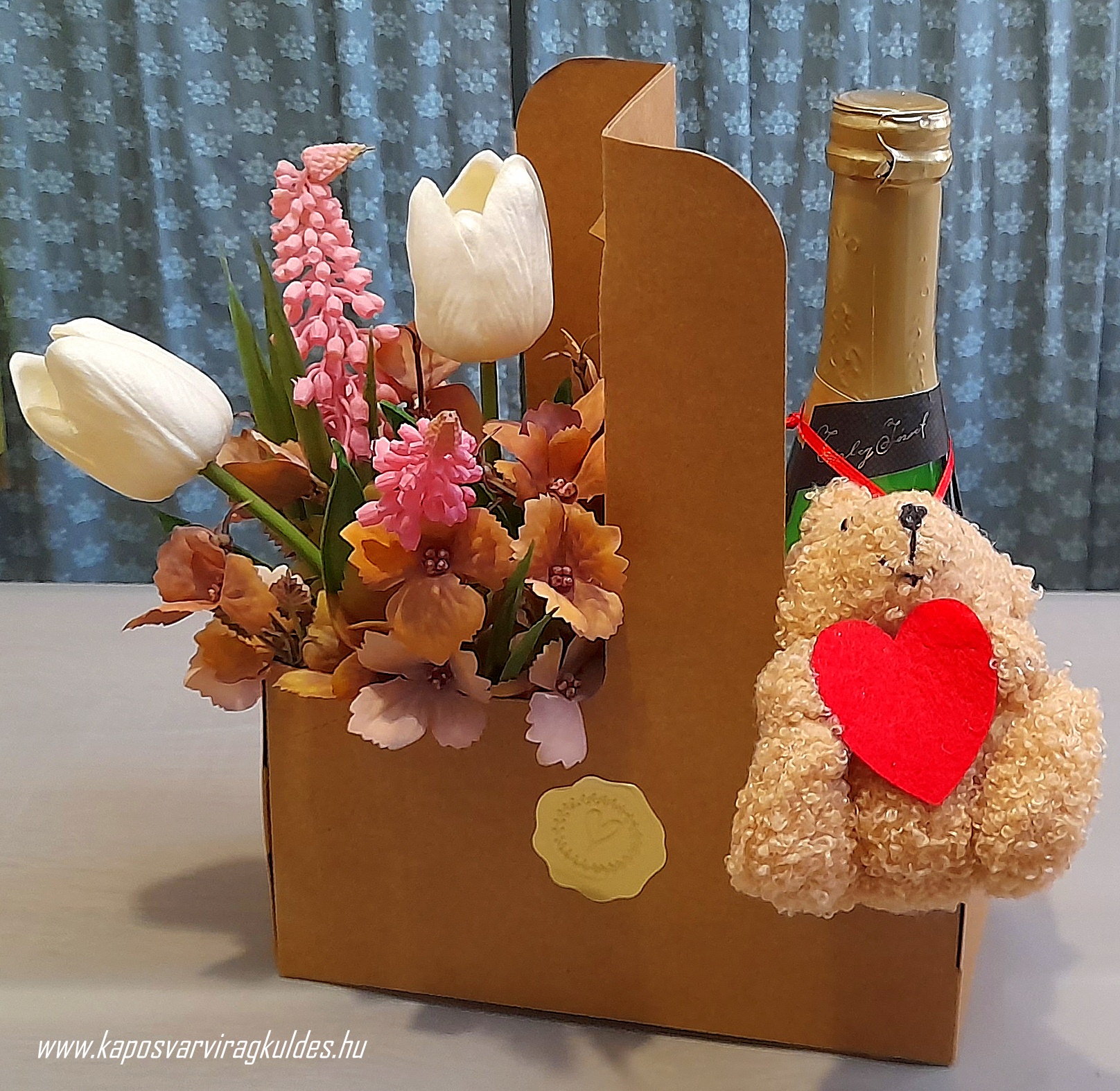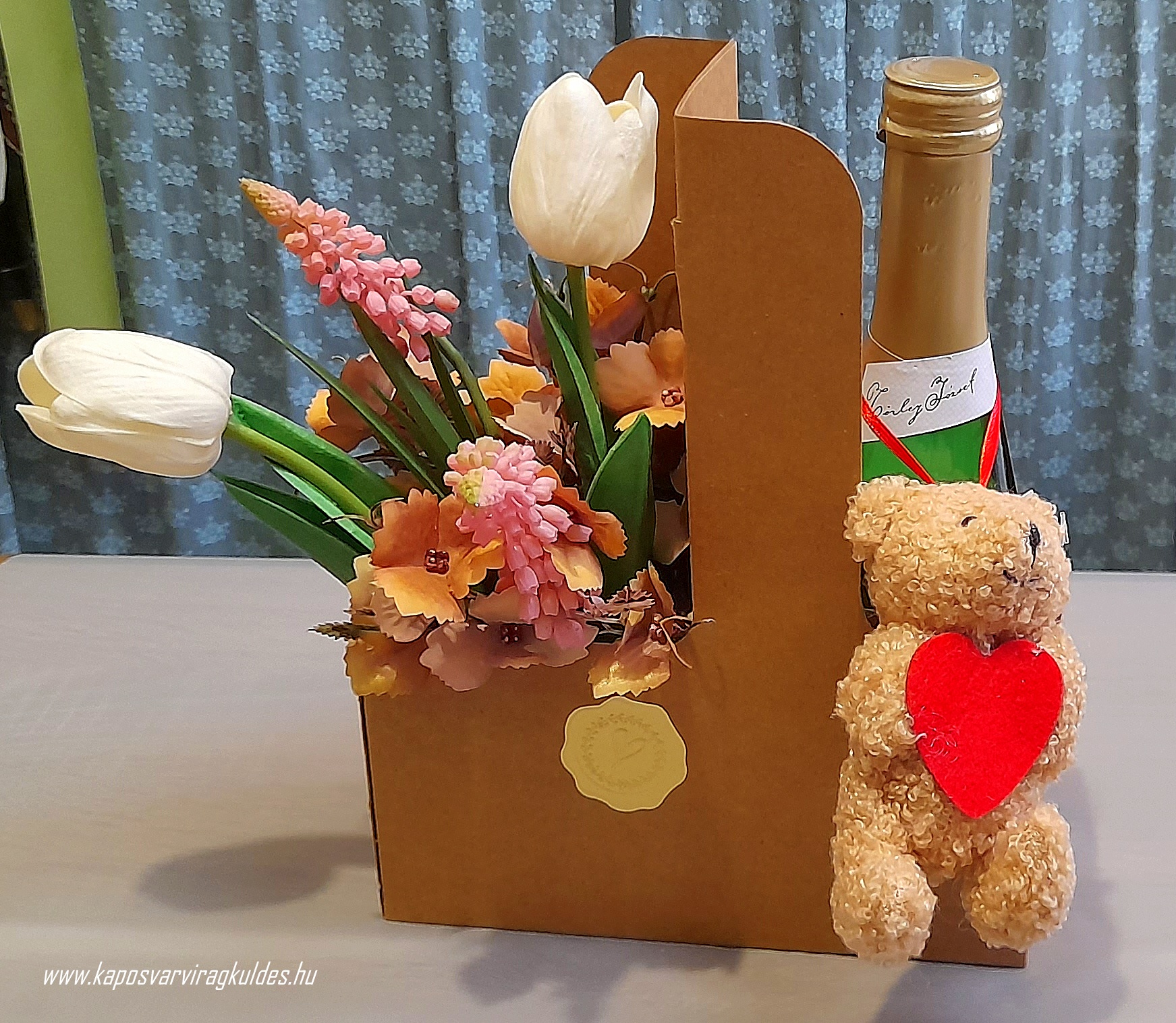 Virágbox minipezsgővel (alkohol tartalmú termék! ) , macis szívvel, művirágokból!